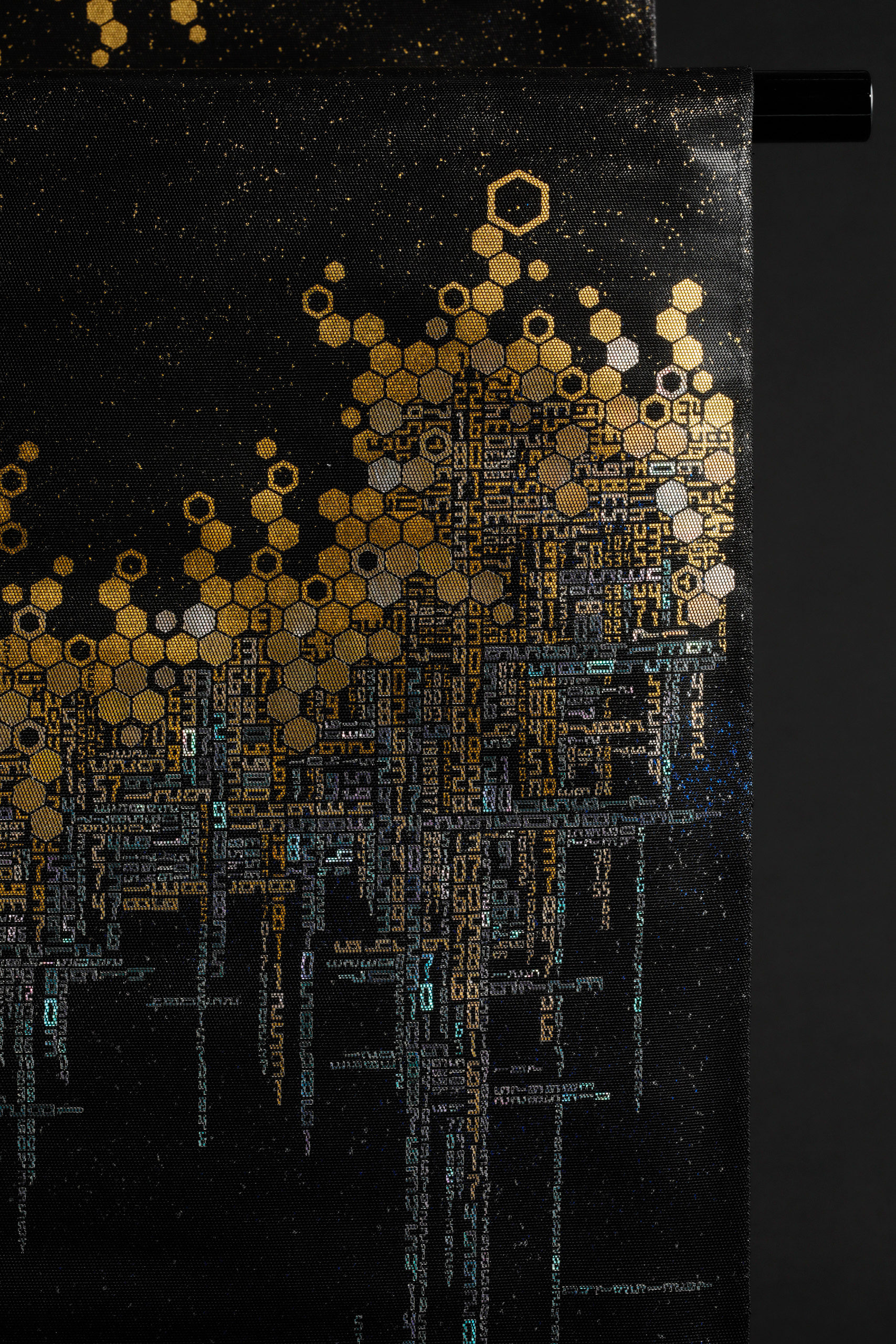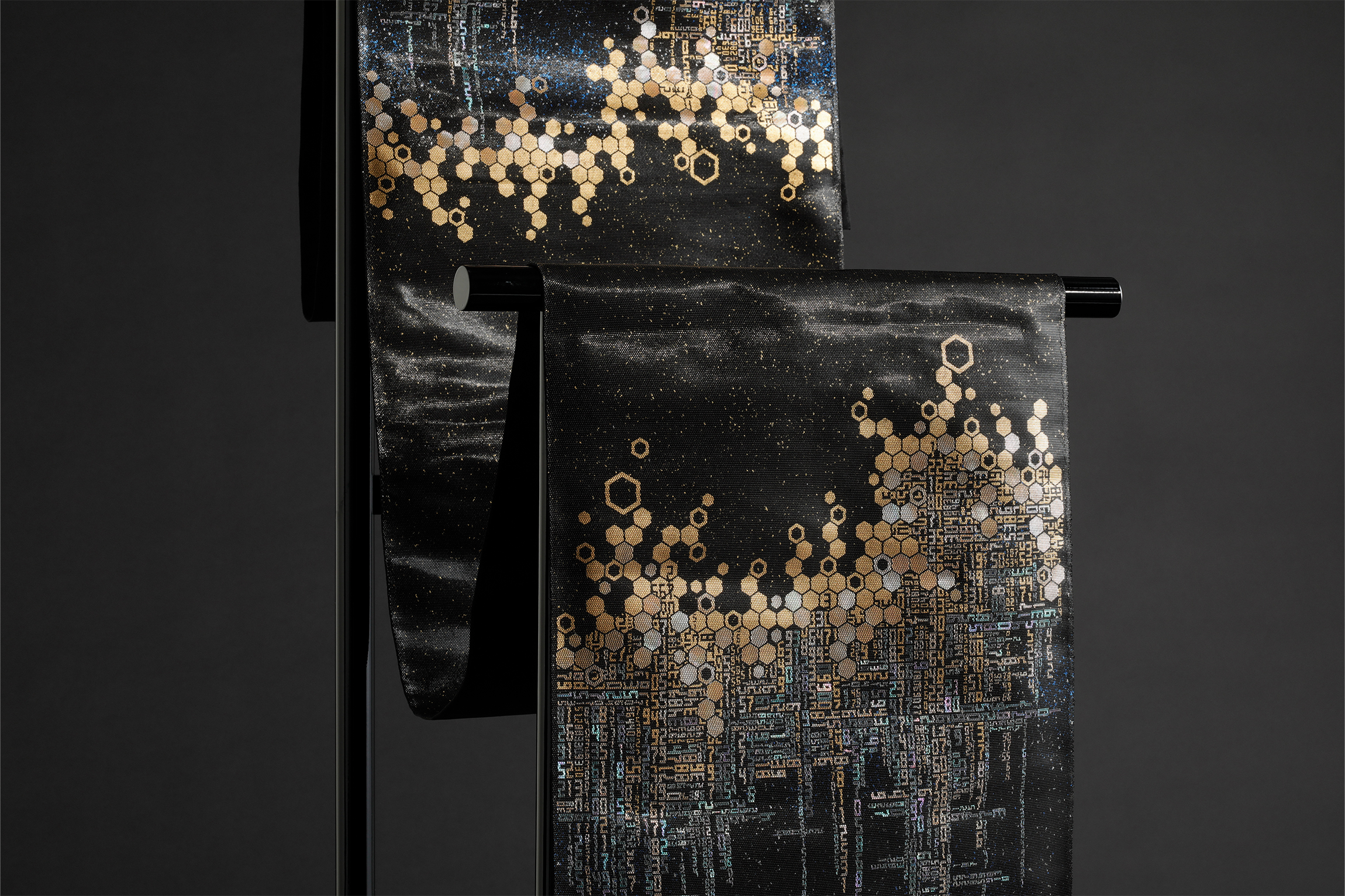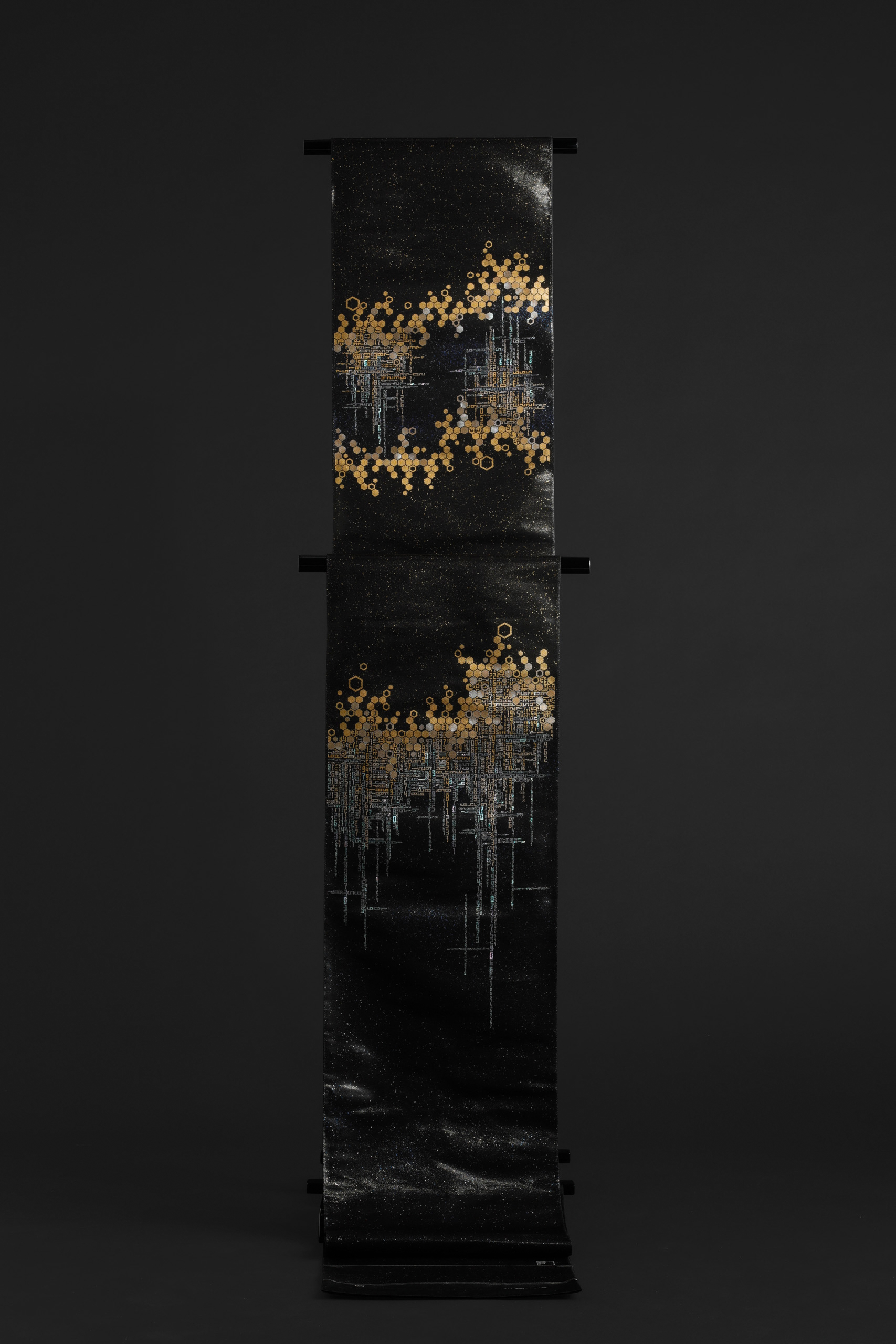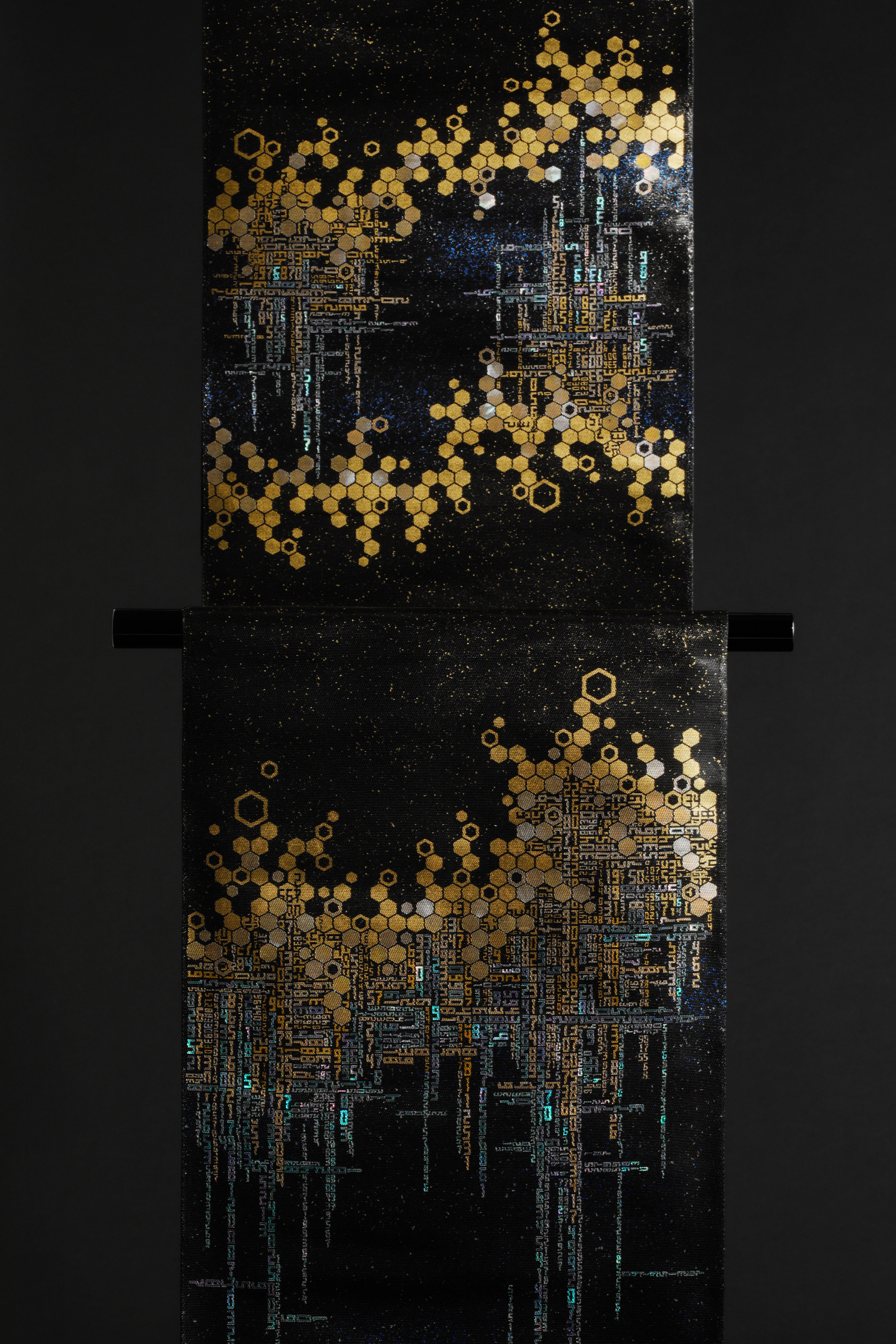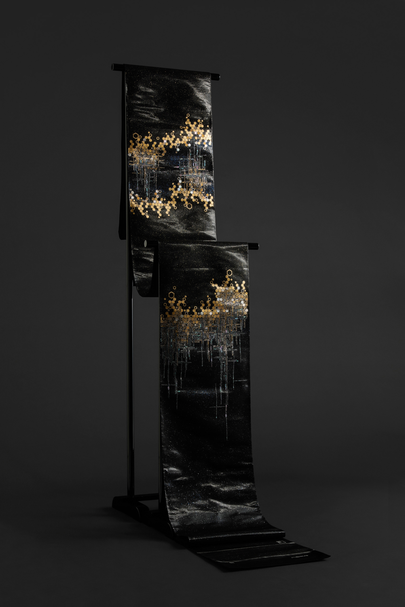 百千金彩螺鈿帯「龍脈」 Play Pause Unmute Muteタイトル:百千金彩螺鈿帯「龍脈」 サイズ:W31 × D0.5 × H 470±4.5 (cm)トップ » 螺鈿帯の作品 » 百千金彩螺鈿帯「龍脈」